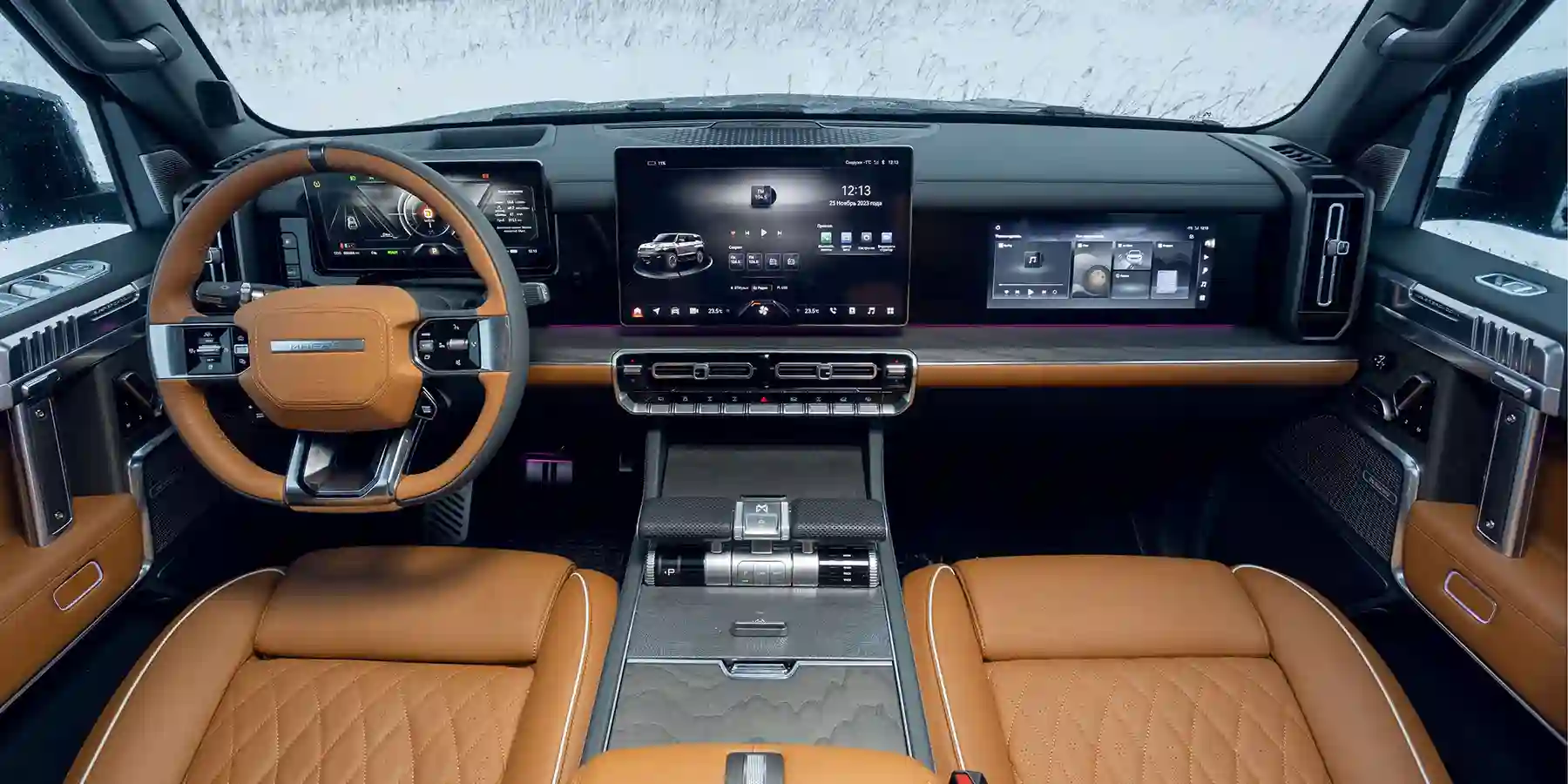 Роскошный интерьер M‑HERO I выполнен из высококачественных материалов отделки, включая кожу Nappa и шпон редких пород дерева. Рулевая колонка имеет функцию памяти и электрически регулируется по вылету и высоте. Передние и задние кресла, помимо широкого диапазона регулировок, имеют функции обогрева, вентиляции и массажа. Комфорт пассажиров обеспечивает задний диван с электрорегулировкой по 8 направлениям, включая четыре варианта настройки поясничной поддержки, и наличие клавиши Boss Key, которая позволяет управлять положением переднего пассажирского сиденья со второго ряда. Но и это далеко не все: меню панели приборов, блок мультимедиа, включая монитор в подлокотнике задних пассажиров ультратехнологичного внедорожника, полностью русифицированы и подготовлены для эксплуатации российскими пользователями. Сервисы Яндекс Авто (музыка и навигатор) предустановлены в ПО электромобиля.